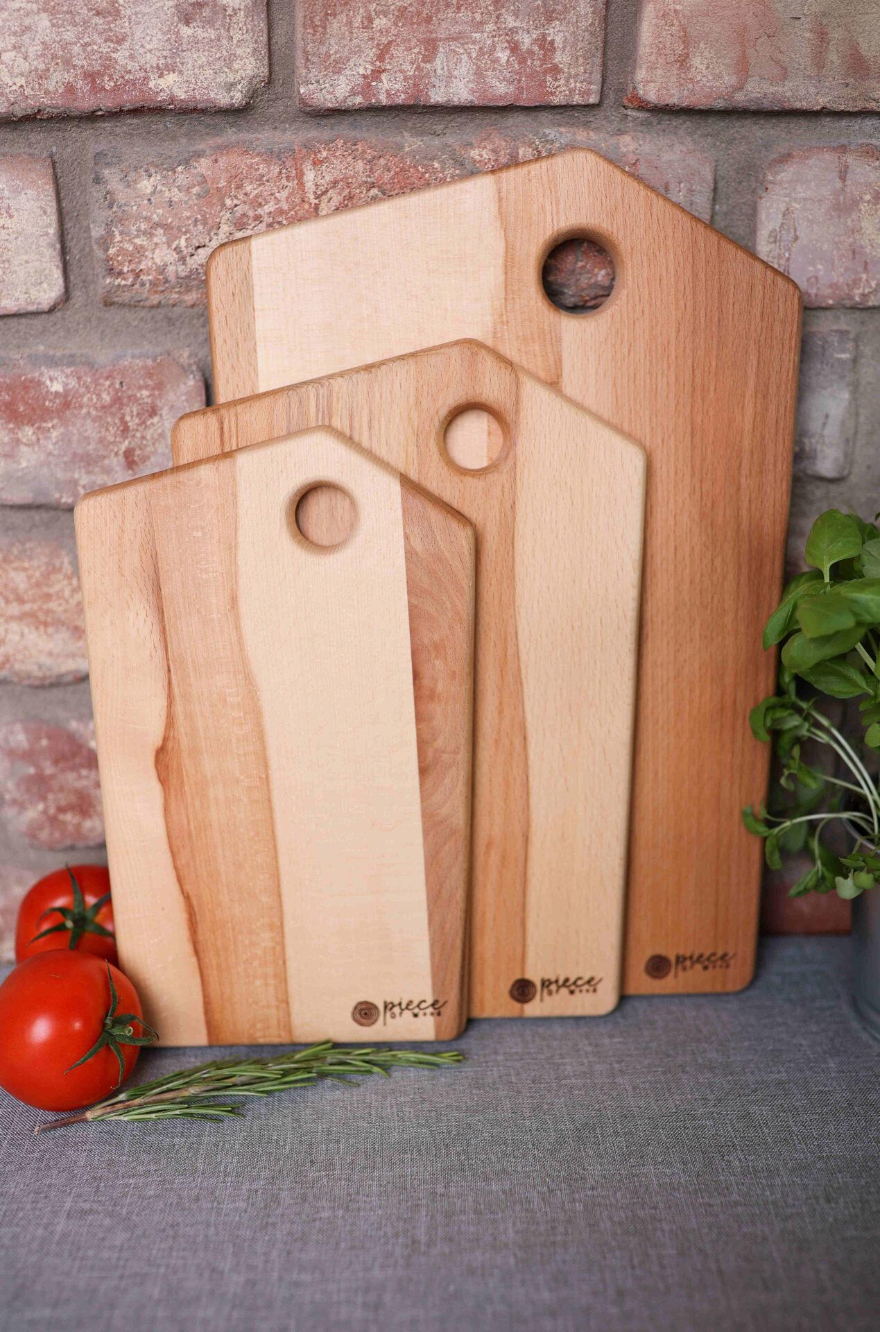 Zestaw 3 Drewnianych Naturalnych Desek do Krojenia z Praktycznym Uchwytem -Niezbędna w Każdej Kuchni