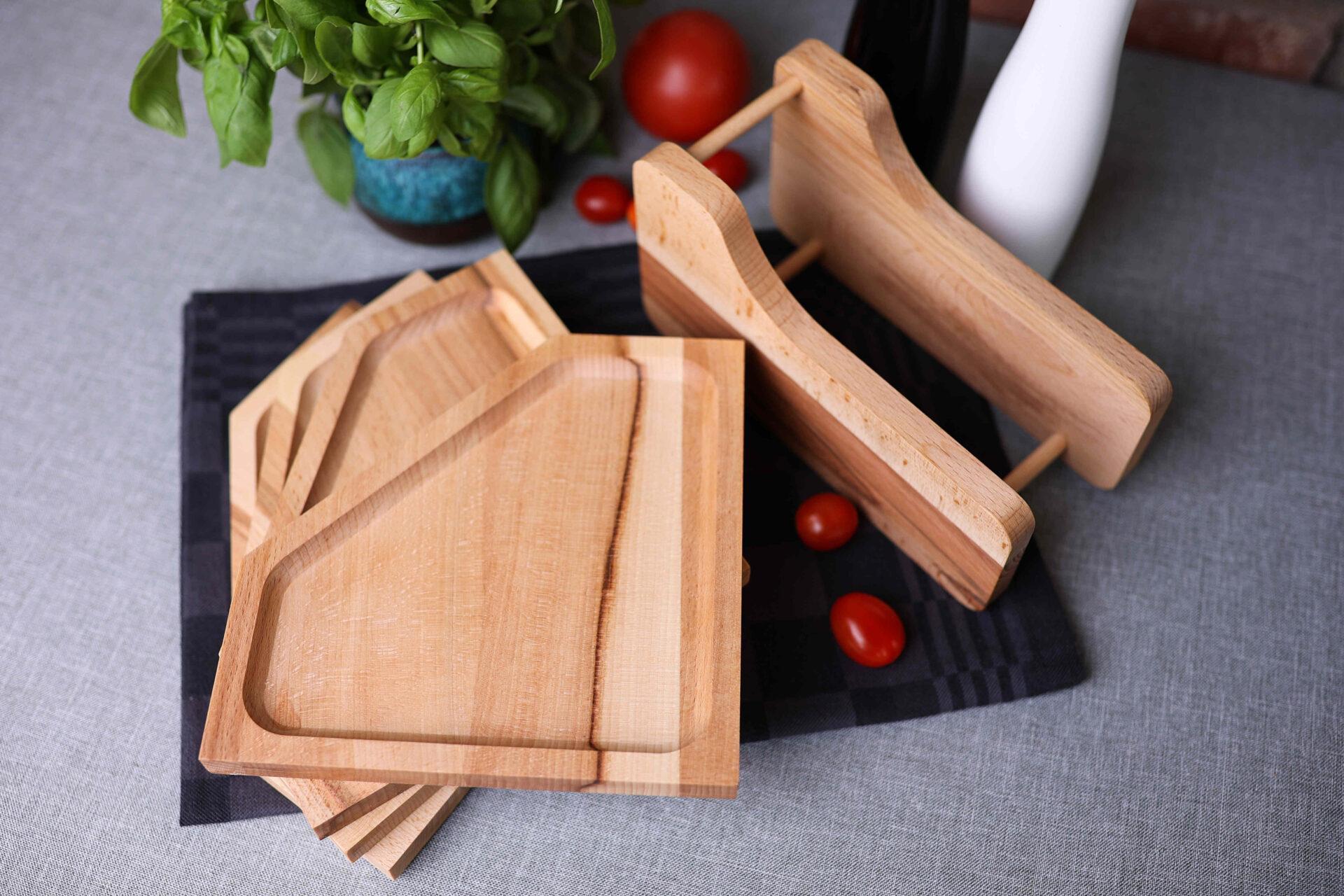 Drewniany Zestaw 4 Tacek z Eleganckim Stojakiem–Praktyczne Rozwiązanie do Serwowania